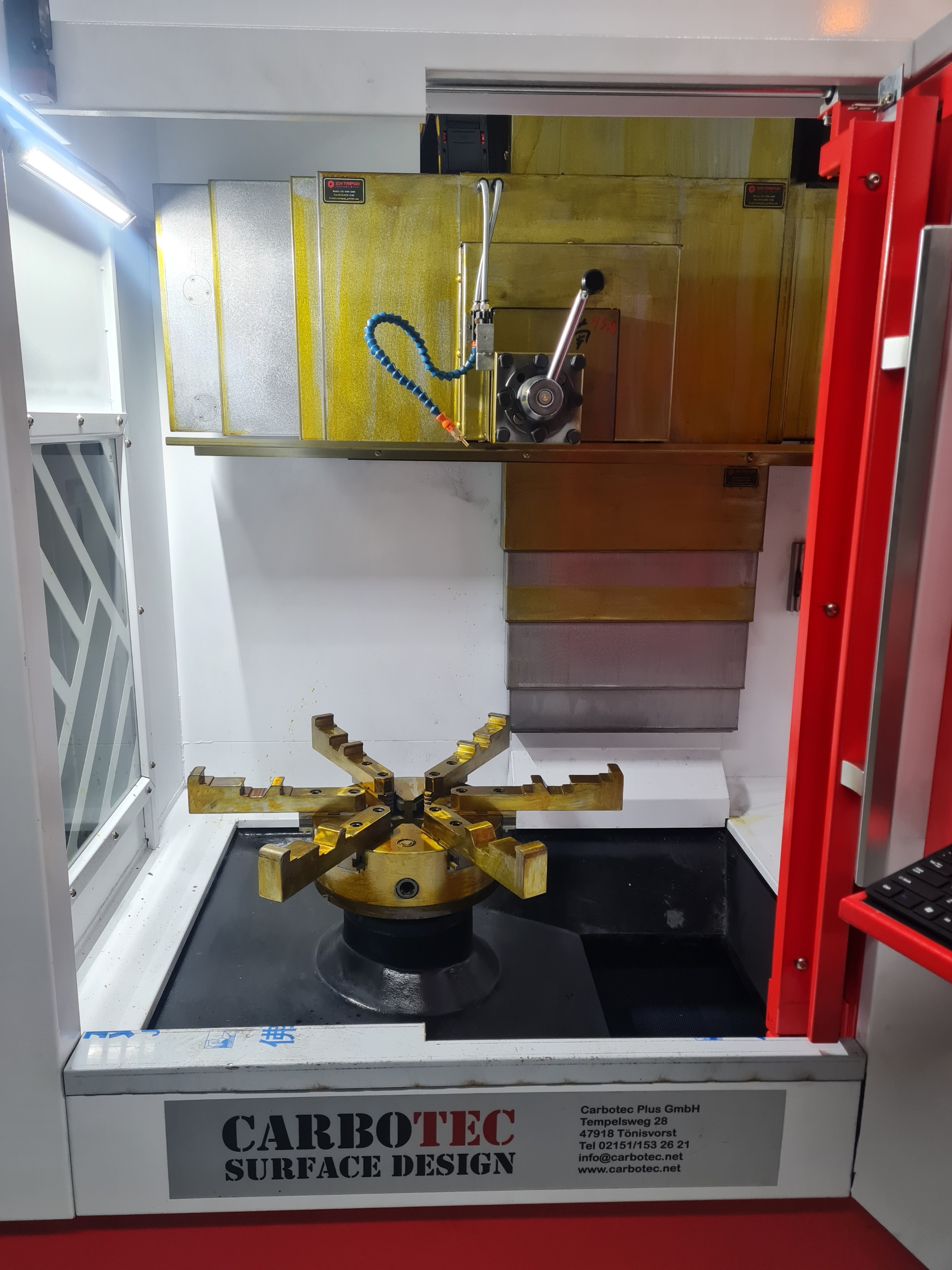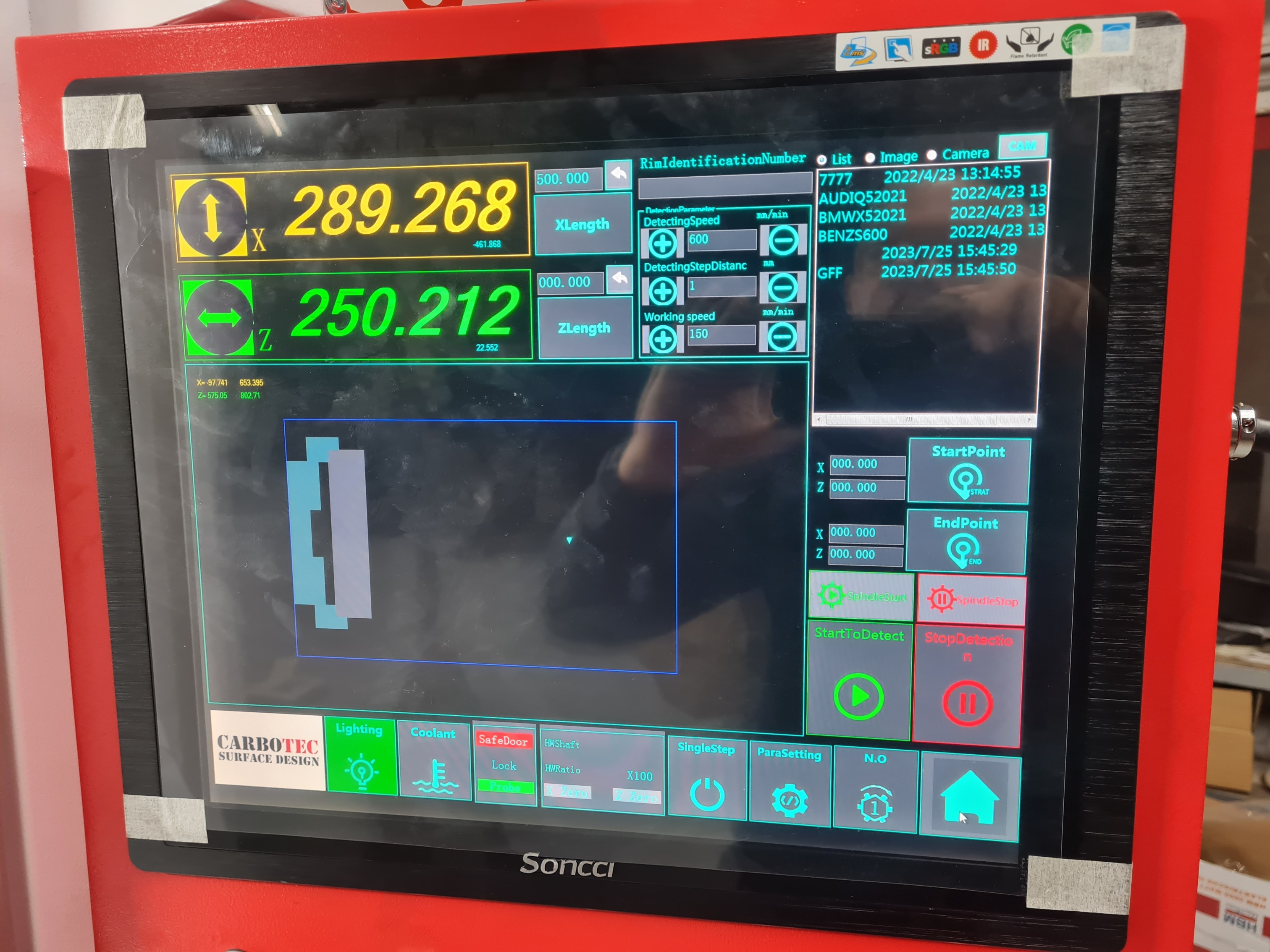 Glanzdrehmaschine Typ C28VT Touch Screen für die Felgenbearbeitung. * maximaler Felgendurchmesser 28" * wahlweise Naß- oder Trockenbearbeitung * 6-Backen-Spannfutter * Spindelbohrung 60mm, * Spindeldrehzahl 50-2000rpm, * Schnittgeschwindigkeit 0,1-1000mm/min, * Manueller 4-fach Werkzeughalter * Taster zur Erfassung der Felgenkontur * Gewicht ca. 1800Kg. * CNC Steuerung und Software integriert * komplette Bearbeitung in der Maschine, kein extra PC * mit Kühlmittelvorrichtung * Incl. Zubehör: Tasterhalter mit Tastspitze, Drehmeißel, Kleinwerkzeug, Spezial Optimierungs Software 12 Monate Gewährleistung.